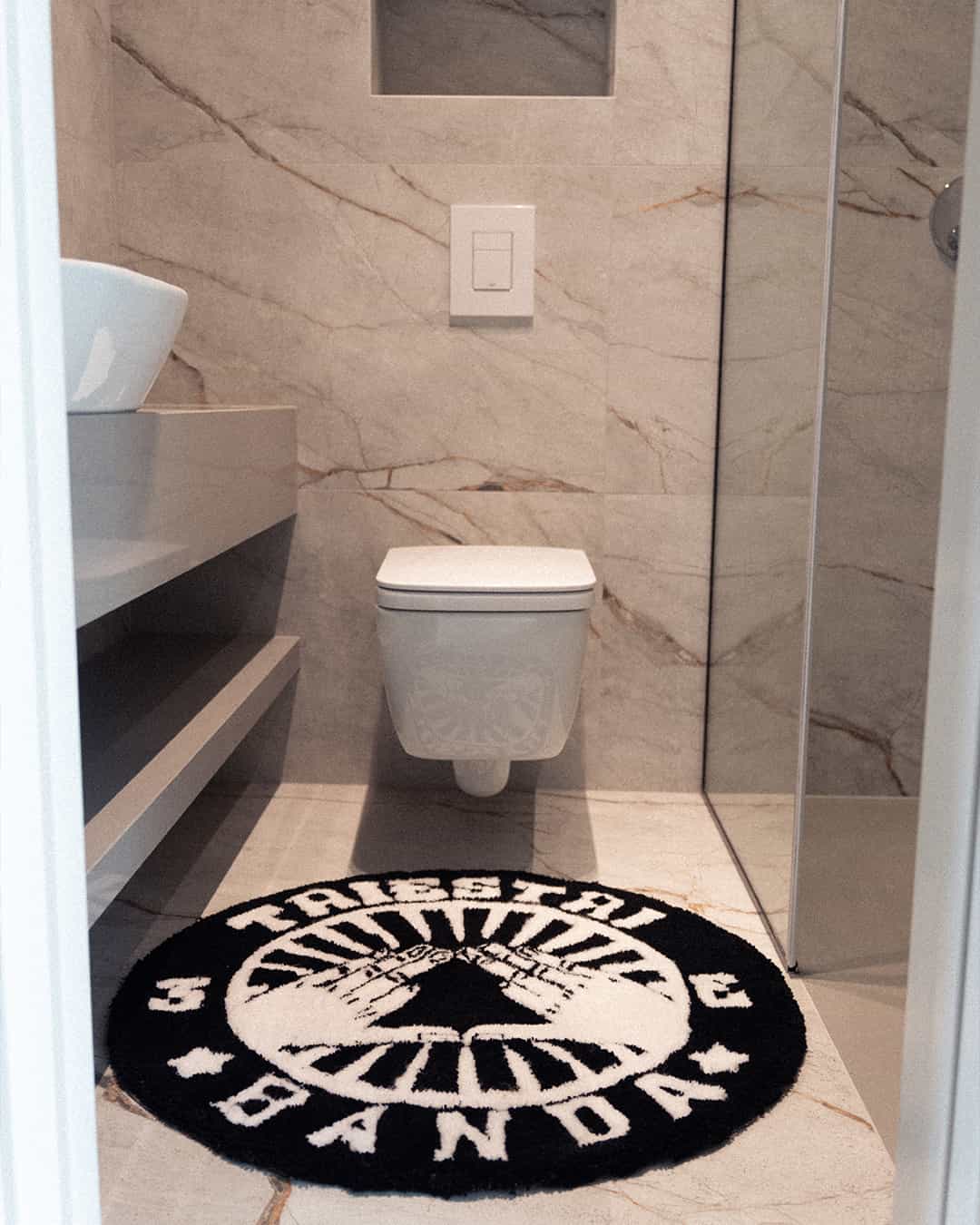 This circular rug features the iconic Triestri Banda logo in striking black and white, adding a bold and stylish touch to any space. With its clean, minimalist design, it’s the perfect piece to showcase your appreciation for the brand while enhancing your room’s aesthetic. Durable and eye-catching, it effortlessly blends art and function.