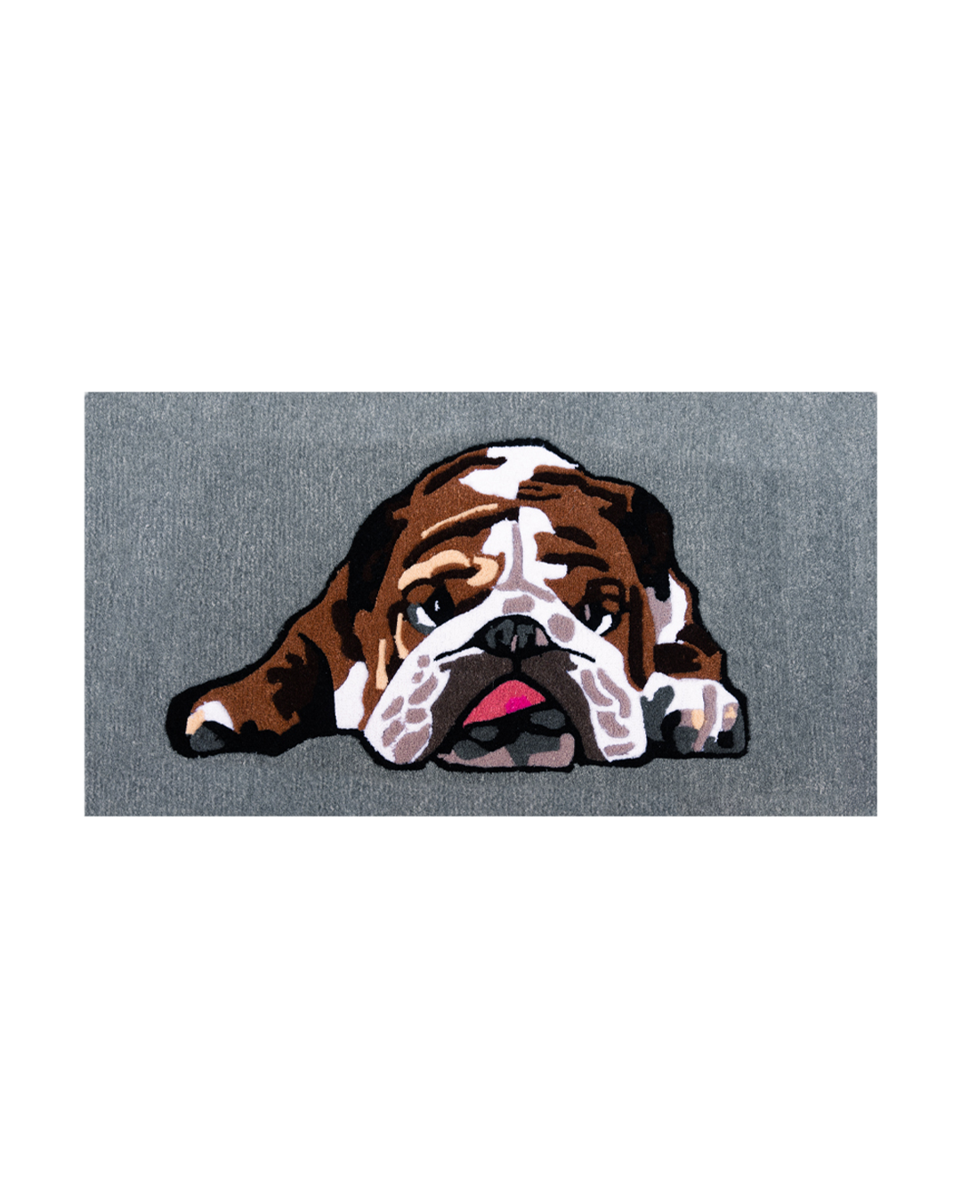 This cozy and playful hand-tufted rug features a bulldog resting on paws with his tongue sticking out in a relaxed pose. Set against a soft grey background, the detailed design captures the charm and personality of the breed. This rug adds warmth and character to any space—perfect for dog lovers and those who appreciate unique, handcrafted decor.