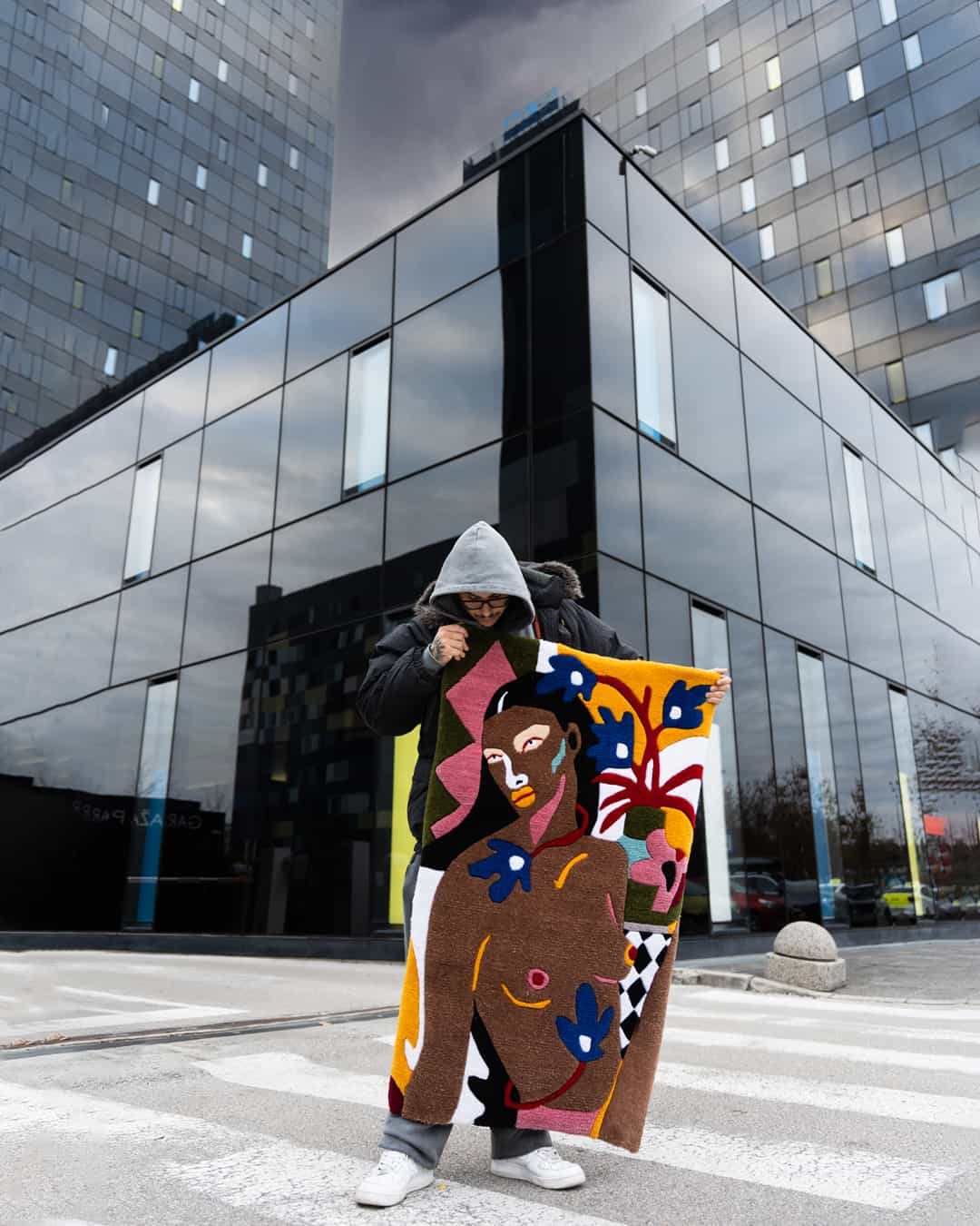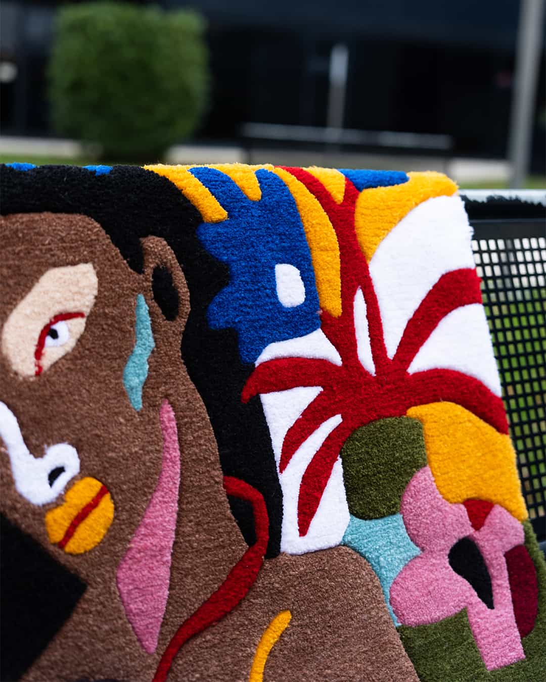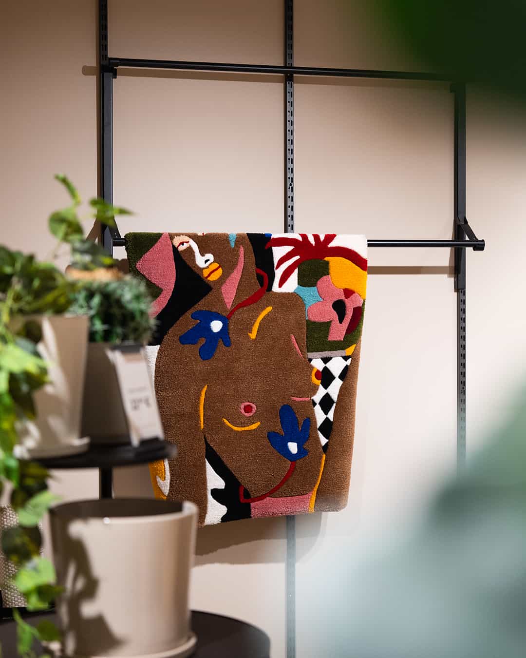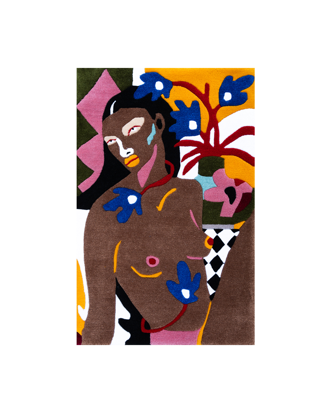 This vibrant rug features a bold, abstract design of a black, nude woman with an array of colorful flowers. The messy yet striking composition brings a sense of elegance and energy to any space. A unique fusion of art and style, this rug adds a playful and expressive touch to your decor.