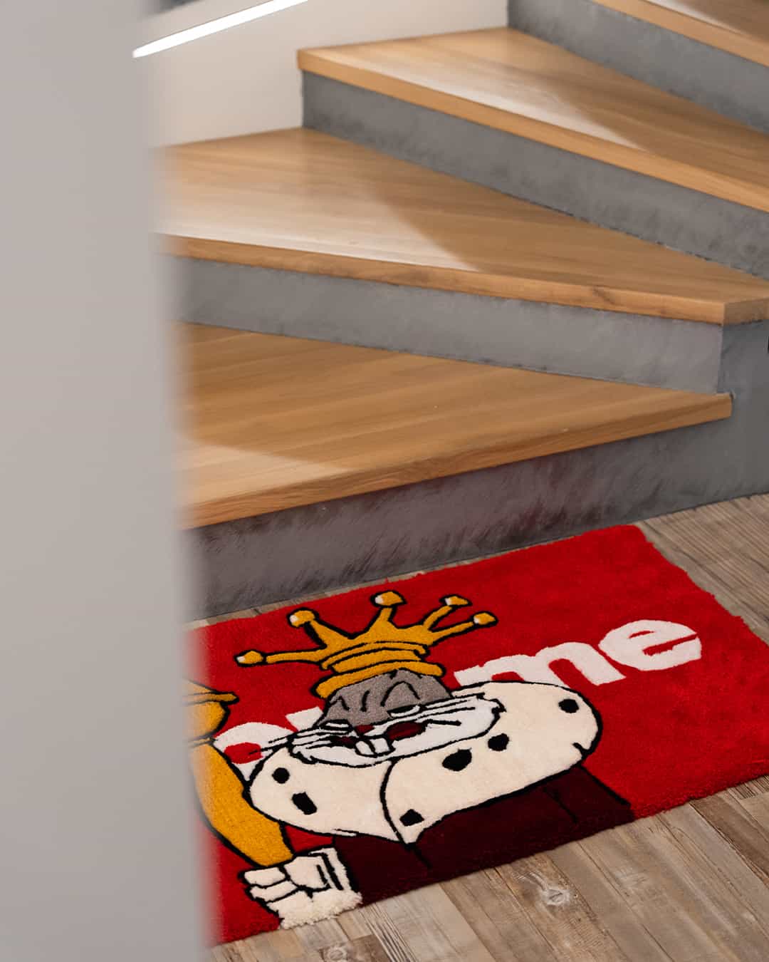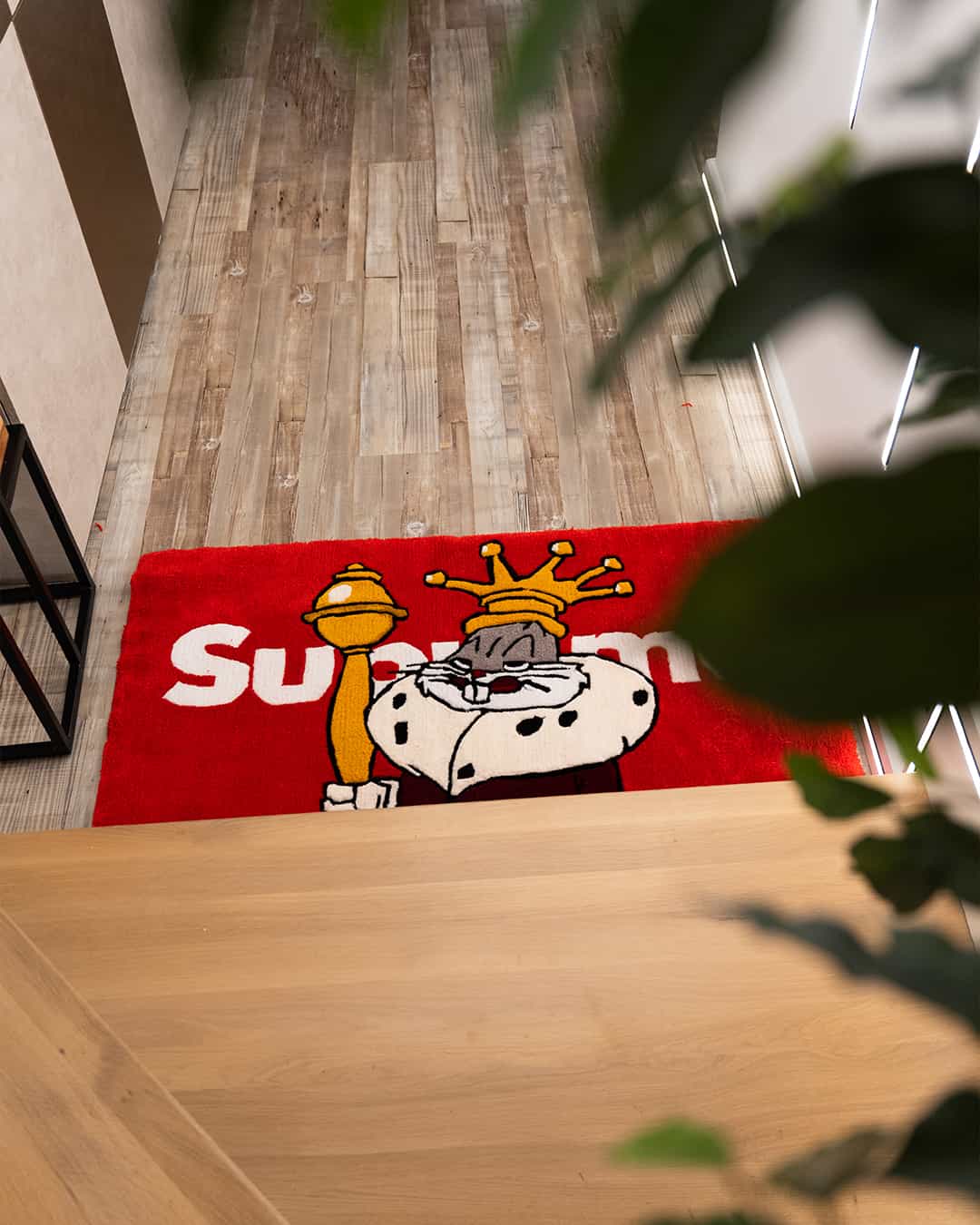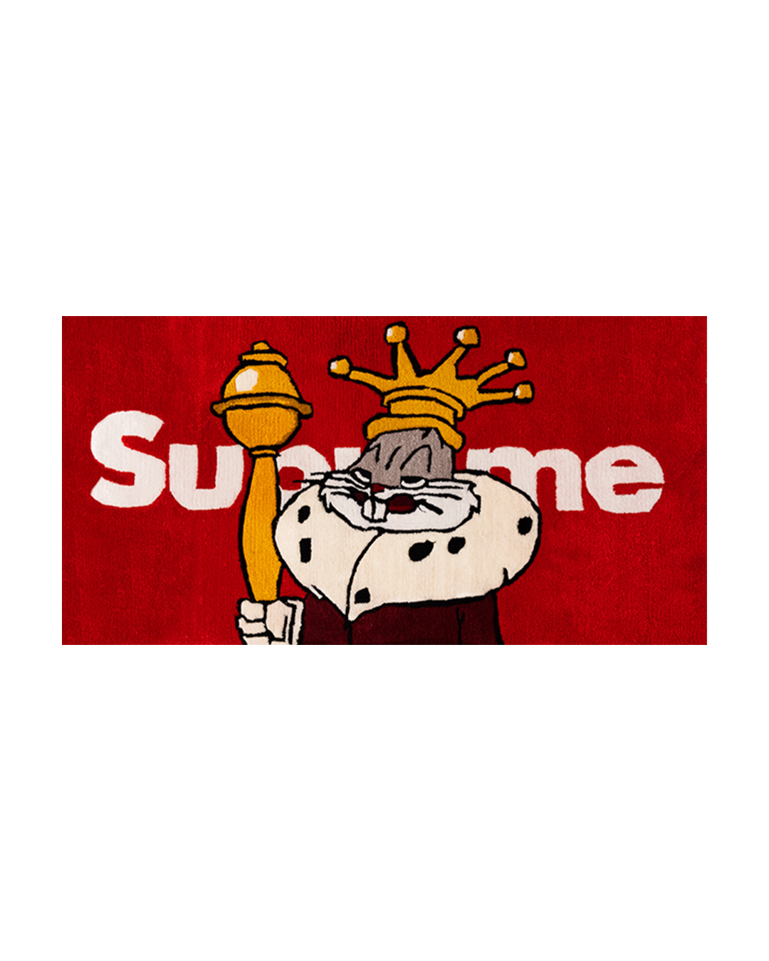 Elevate your space with this vibrant hand-tufted rug featuring a bold red background and striking white “SUPREME” lettering with King Bugs Bunny intersecting the logo. Crafted with meticulous attention to detail, this rug blends iconic pop culture with high fashion, making it a standout piece for any room.