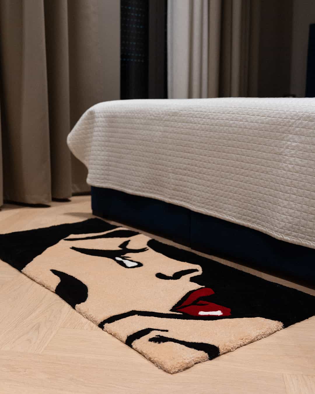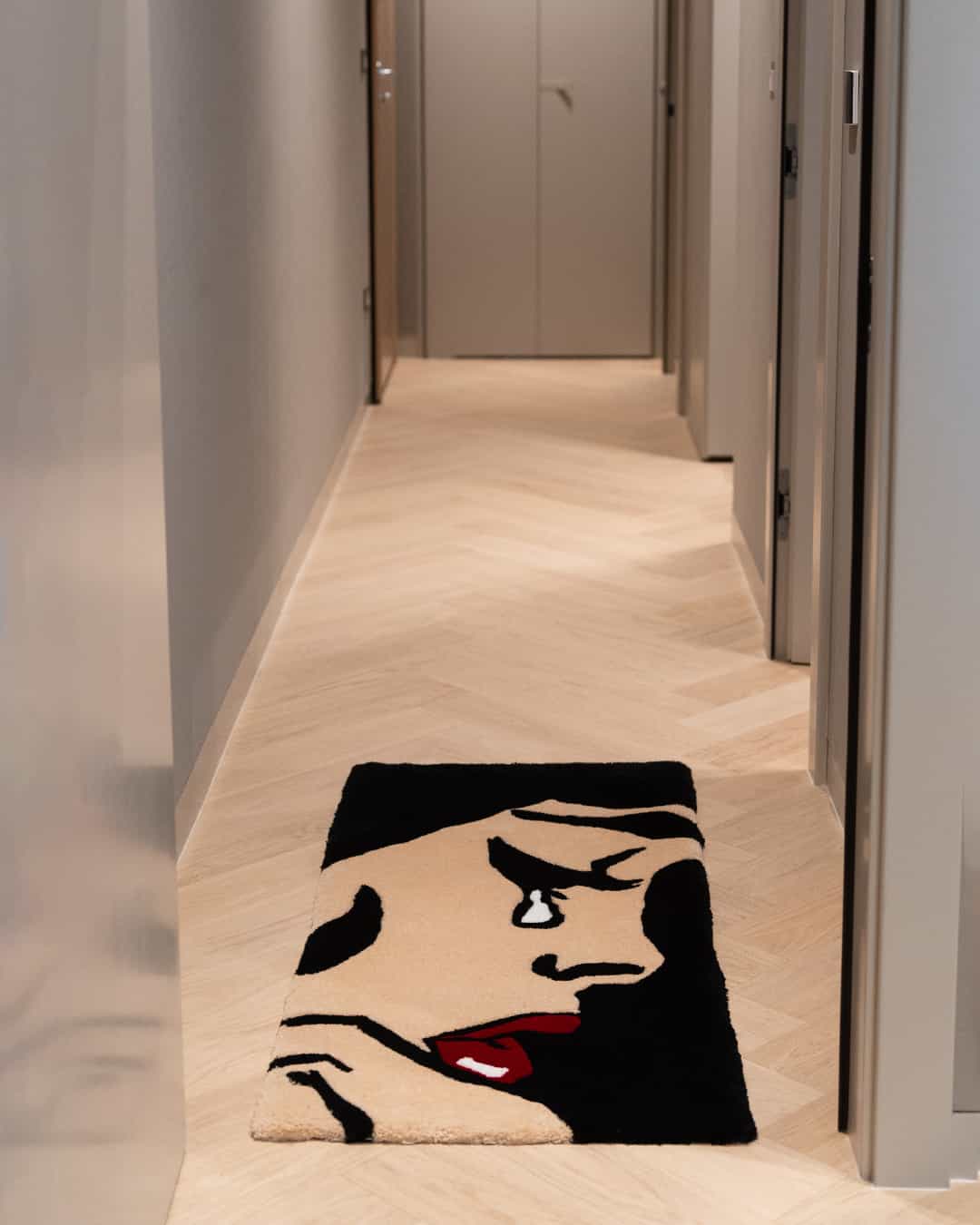 This rug features a striking side profile of a woman in the midst of a tearful moment. With bold lines and expressive detail, it captures raw emotion in a visually dynamic way. Perfect for adding an artistic, dramatic touch to any room, this rug blends modern design with a touch of vulnerability and storytelling.